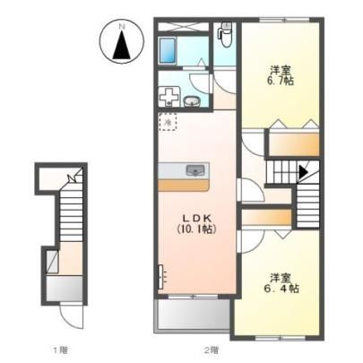 2010年4月築の2階建てのアパートで、お部屋は2階建ての2階部分です。