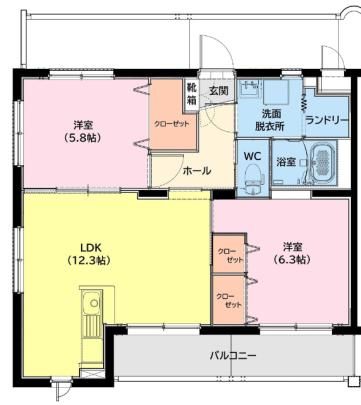 間取り 2LDK ( LDK12.3畳/洋室6.3畳/洋室5.8畳 )